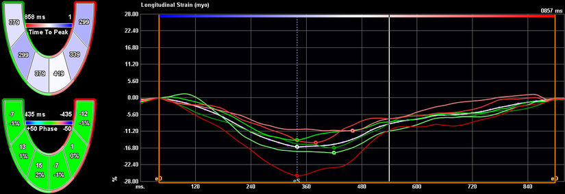 example of regional (coloured) and average (white) longitudinal strain curves in an apical 4-chamber view in a childhood cancer survivor, obtained in commercially available, vendor-independent strain software.