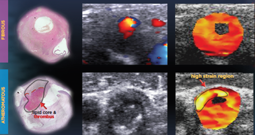 Figure: Histology (right), conventional b-mode incl Doppler (middle), and elastogram (right) of a fibrous carotid plaque (upper row) and atheromatous plaque (lower row),
