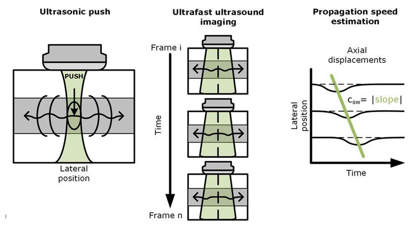 Figure 2 schematically shows the basic principles of the technique. SWE uses one or multiple focussed ultrasound transmissions to create sufficient acoustic radiation force to locally displace the tissue. This local offset of the tissue and the tissue relaxation after release of the force results in (a) shear wave(s) propagating perpendicular to the ultrasound beam, causing transient displacements in the tissue as the wave propagates. The propagation speed of the shear wave can be estimated by measuring the arrival time of a certain characteristic of these transient displacements (f.i. the peak displacement) at multiple positions, using ultrafast ultrasound imaging in combination with speckle tracking or Doppler-based motion estimation. This speed is directly related to the shear modulus µ of the tissue, an absolute measure of the tissue’s elasticity.