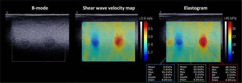Figure 3: B-mode, shear wave velocity map, and corresponding Young’s modulus map/elastogram for a CIRS phantom (Model 040GSE) highlighting the possibility to detect soft and stiff lesions in a moderately stiff background and to quantify their stiffness. The images were acquired using a Supersonic Imagine Ultimate Aixplorer system equipped with an SL10-2 linear array transducer.